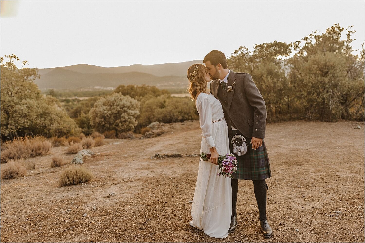 Cómo fotógrafo de bodas, el reportaje de casados es una de las partes que más disfruto. Además, este es uno de los pocos momentos a solas que vas a tener con tu pareja durante la celebración de tu boda. Por todo esto, una vez finalizada la ceremonia, nos tomamos 20 minutos para realizar algunas fotografías. Bea y Paul disfrutaron mucho de este ratito y no tuvieron ninguna prisa, por lo que pude trabajar con ellos cómodamente. Tuvimos la suerte de poder aprovechar la hermosa luz que nos brindaba el atardecer. La novia estaba guapísima con el tocado maravilloso de Graellsia Madrid, que tiene su tienda en Cercedilla, nuestro pueblo.
